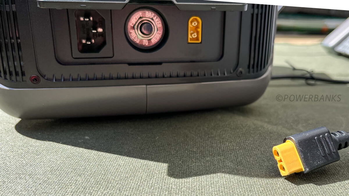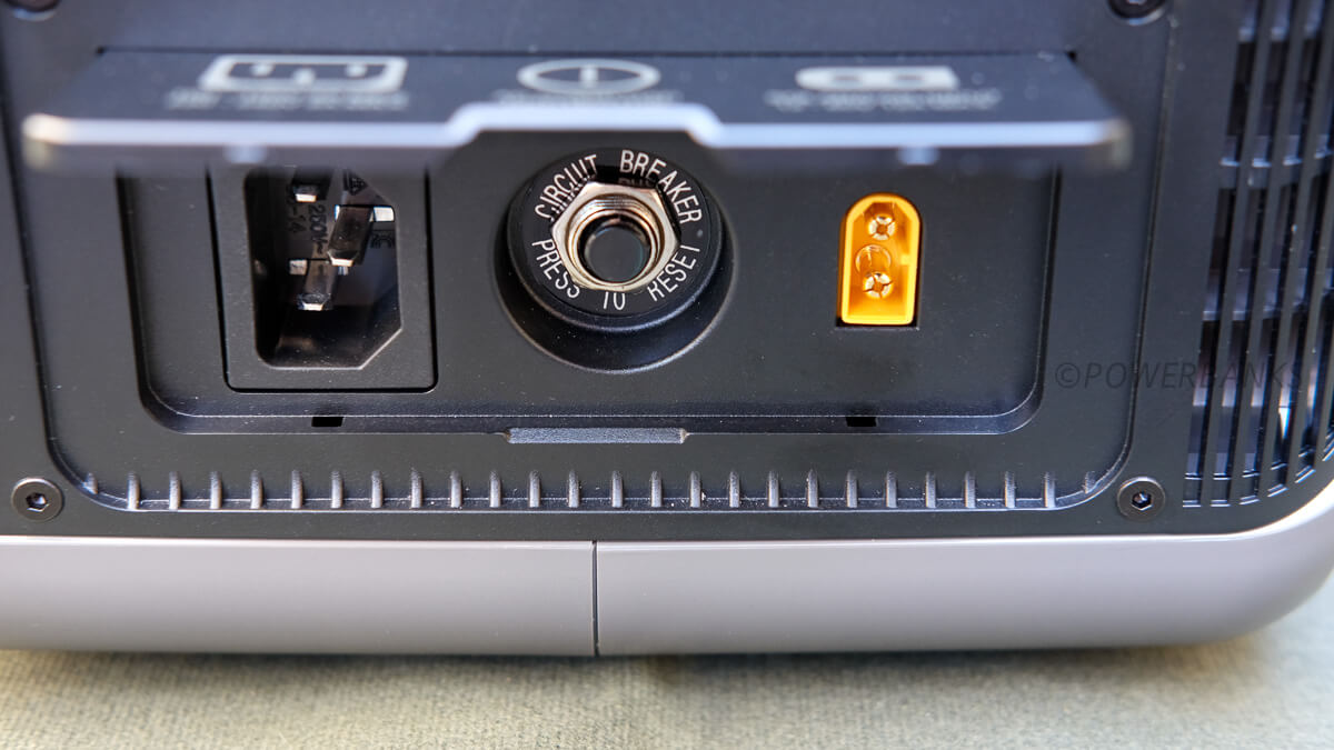 左からACコンセント充電ポート、サーキットブレーカー、XT60ポートです。