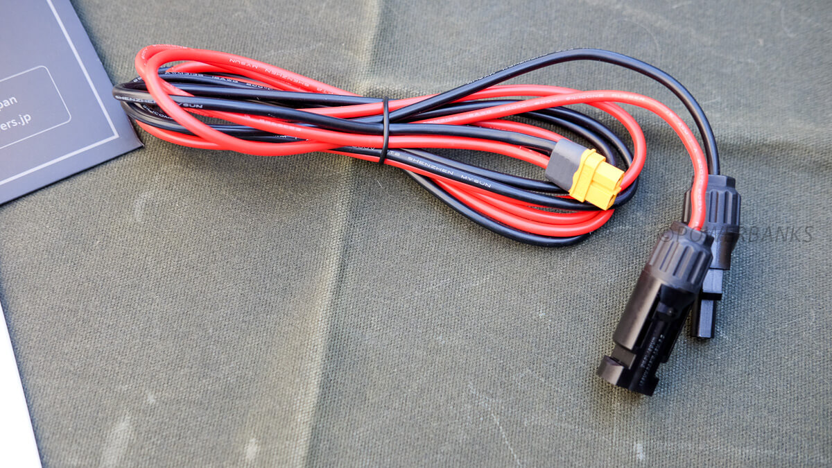 R600には「XT60-MC4ケーブル」が付属しています。このケーブルを使って、XT60(黄色いポート)をR600に差し込み、MC4(二つの口を持つもの)をソーラーパネルと接続します。